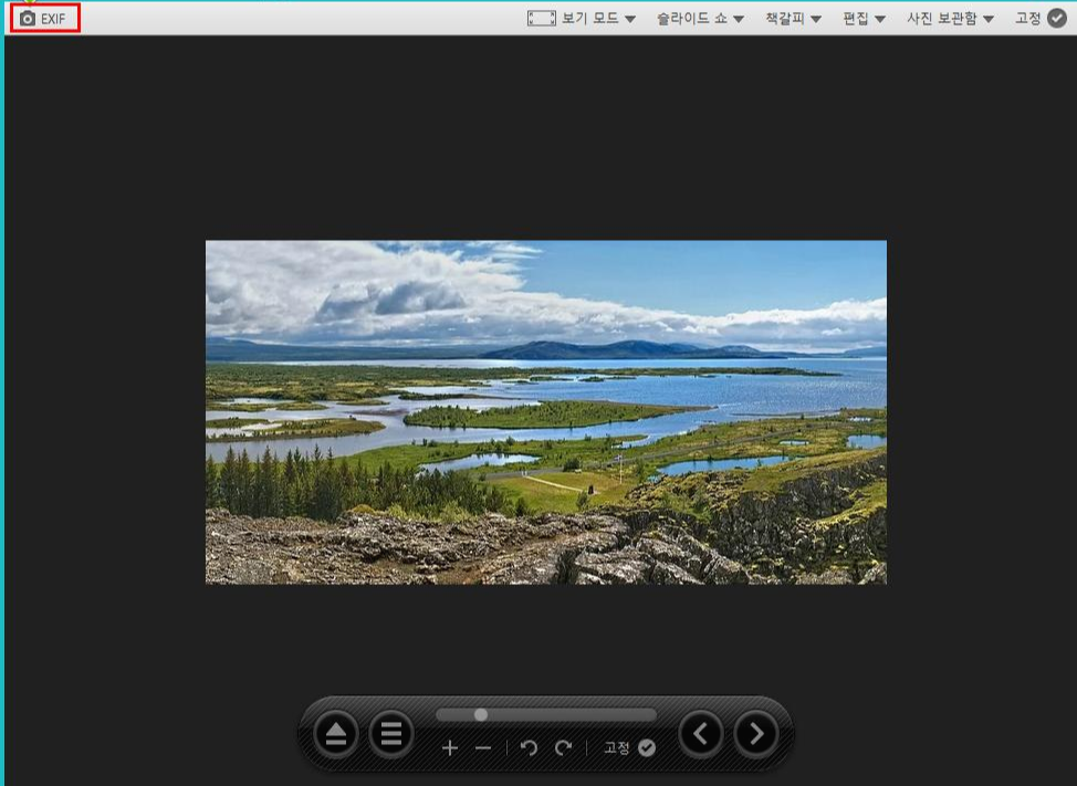 이외에도 꿀뷰는 "필터 적용" 등의 기능과 파일 정보/EXIF 정보를 쉽게 확인할 수 있습니다. 키보드 단축키 "TAB"키를 눌러서 EXIF 정보를 볼 수 있으며 상단 좌측에 위치한 EXIF 버튼을 클릭하셔도 정보를 볼 수 있습니다.