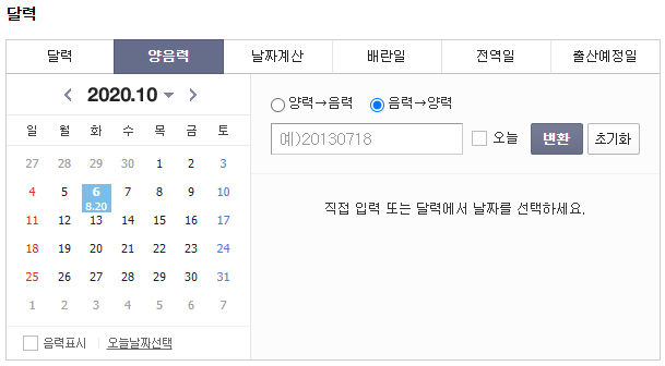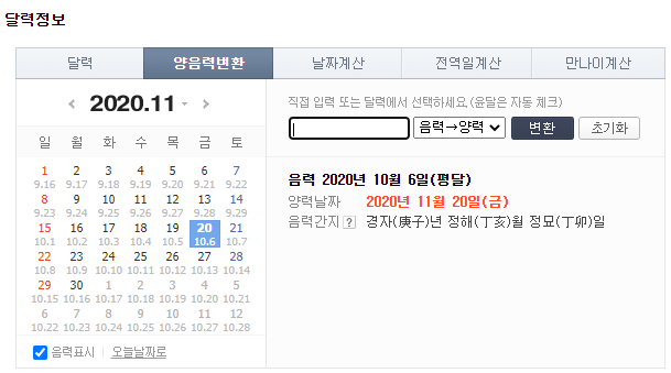 2. 화면에서 보이는 텍스트 박스 입력창에 음력생일을 양력 변환하실 분들은 그대로 궁금하신 날짜를 입력해주시면 됩니다. 음력 2020.10.06을 입력 후 양력으로 변환해보니 2020년 11월 20일로 표시가 됩니다.