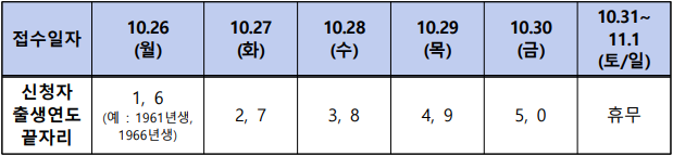 운영시간은 (09:00 ~ 18:00)까지라고 합니다. 단 10월 26일부터 10월 30일까지는 5부제로 접수가 진행된다고 합니다.