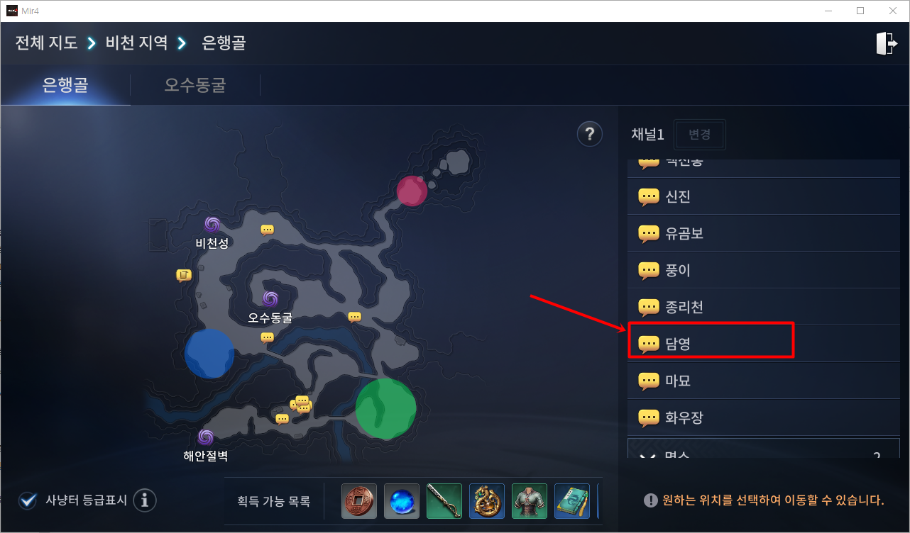 먼저 지도를 킨 후 은행골에 주민NPC 탭을 눌러서 "담영"에게 이동해주신 후 대화를 진행해주시면 됩니다.