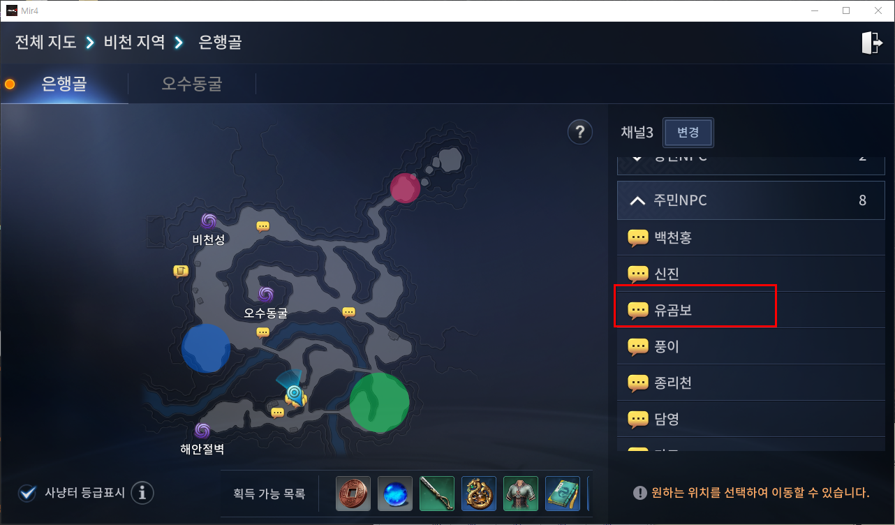 유곰보는 은행골 지역에 있는 주민NPC입니다. 맵을 켜신 후 "유곰보"를 클릭하여 이동하시면 편리합니다.