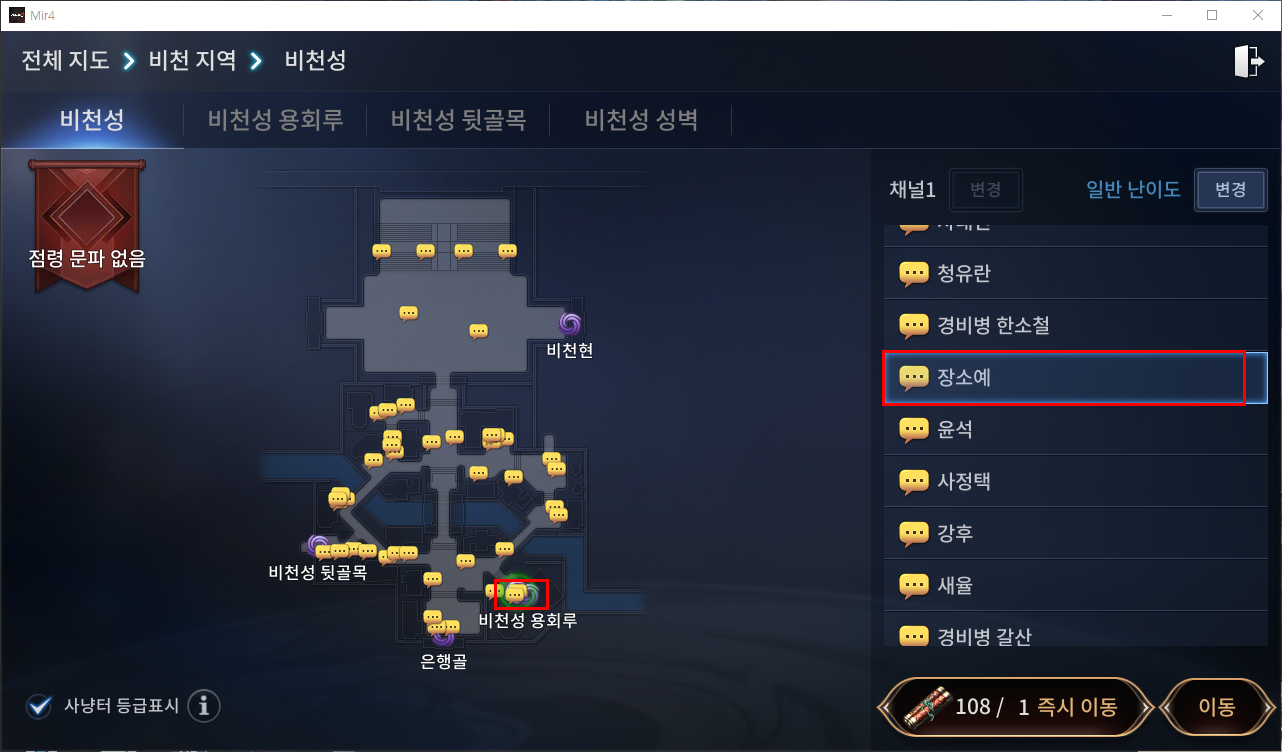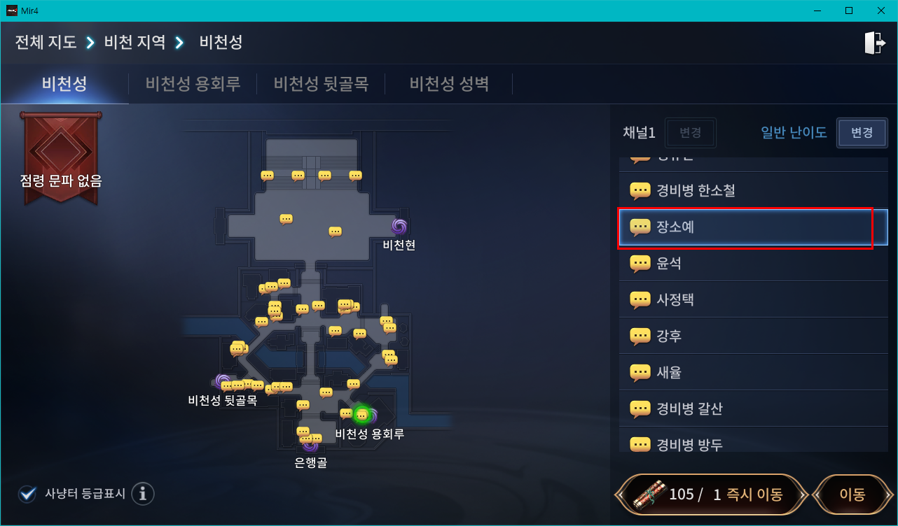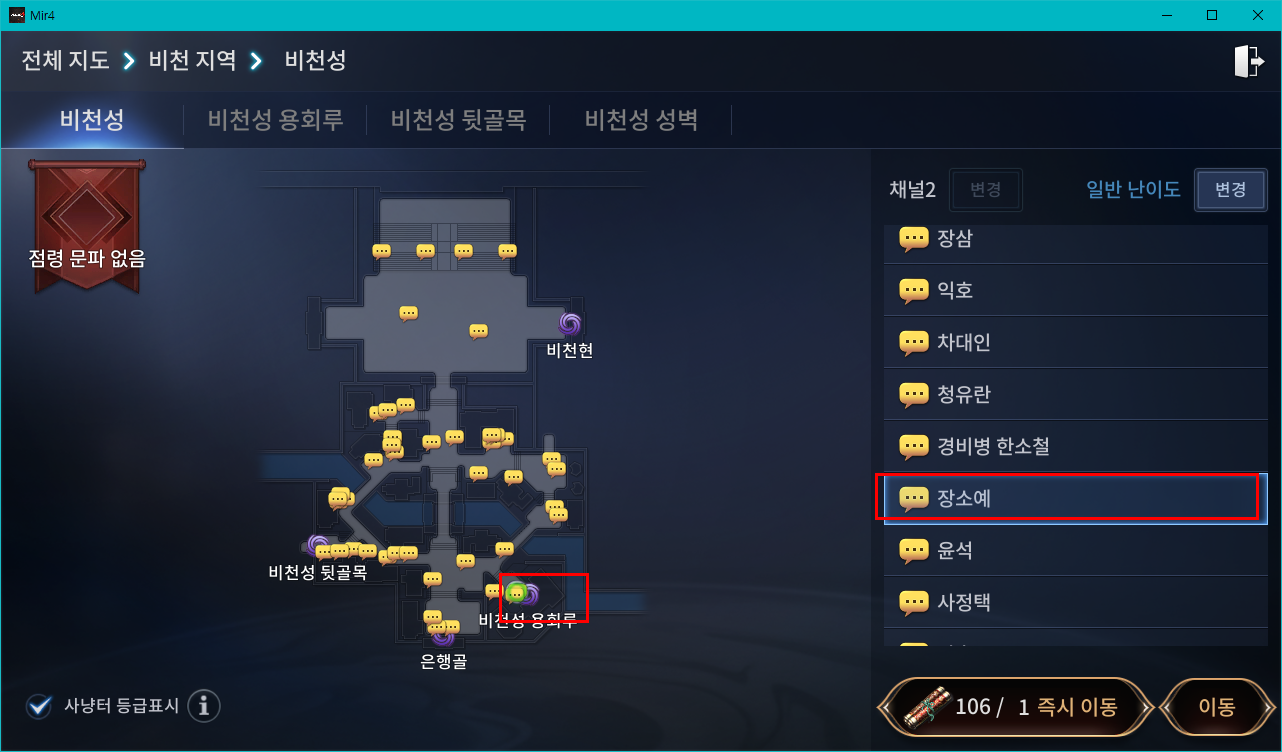 비천성 주변 NPC를 눌러 장소예를 클릭하여 즉시 이동 또는 이동을 눌러서 이동 후 대화를 진행해주시면 됩니다.