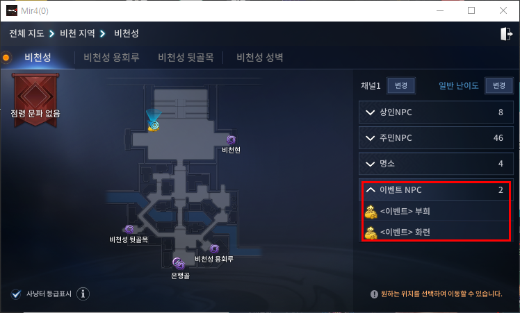 이벤트 NPC는 비천성에 위치하고 있습니다. 지도상에서 이벤트 NPC 이동을 통해 이동하시면 편하게 갈 수 있습니다.