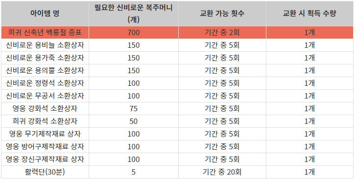 목록은 총 15개가 있습니다. 아이템별로 기간이 있습니다. 물약은 무제한이며, 영웅 청룡 조각상은 기간 중 3회, 고급 신축년 백룡절 증표는 기간 중 2회만 교환이 됩니다. 이 외의 품목은 일 5회입니다. (신비로운 소환 상자는 일 1회만 가능)