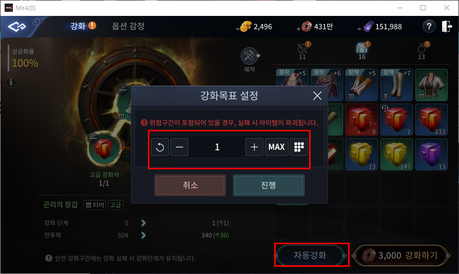 고등 등급 장비에 대한 '자동강화' 기능 추가