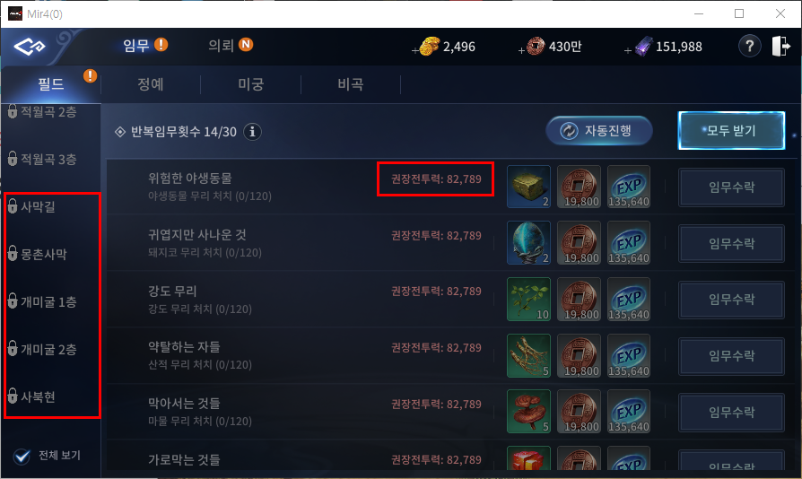 또한 몽촌 지역이 오픈되면서 새로운 임무 및 의뢰 퀘스트도 생겼습니다. 몽촌 지역 중 제일 레벨이 낮은 100레벨 지역의 사막길을 살펴보면 퀘스트 권장 전투력이 8만 2천에 해당되는 것을 볼 수 있습니다. 대략 9만 5천~ 10만정도의 투력은 되야 수월한 진행이 가능할 것으로 예상됩니다.