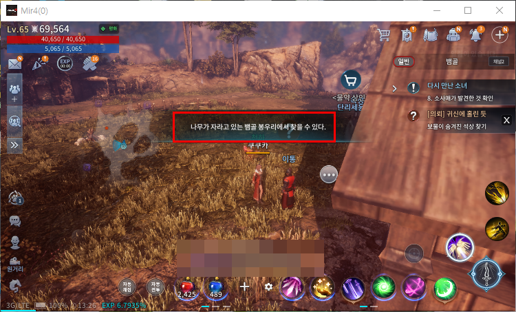 퀘스트 자동 이동이 되는지 확인을 위해 수락한 의뢰 퀘스트를 눌러보시면 "나무가 자라고 있는 뱀골 봉우리에서 찾을 수 있다." 라는 힌트 문구만 나오게 됩니다. 당황하지 마시고 잘 따라와주시면 손 쉽게 완료할 수 있습니다.