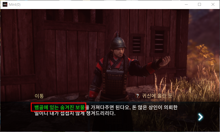 뱀골 의뢰 귀신에 홀린 듯 퀘스트를 받으신 후 대화를 살펴보시면 힌트가 있습니다. 뱀골에 있는 숨겨진 보물이 있다고 합니다. 이 대화를 통해 퀘스트 수행 위치는 뱀골이라는 것을 알 수있습니다.