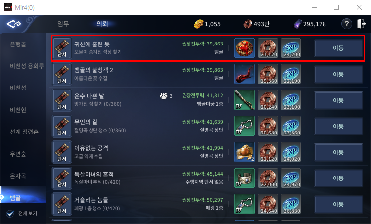 먼저 의뢰 퀘스트 진행을 위해 뱀골 의뢰에 있는 귀신에 홀린 듯을 받아주세요. 이동을 클릭하신 후 NPC에게 퀘스트 진행을 하시면 됩니다.