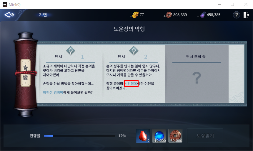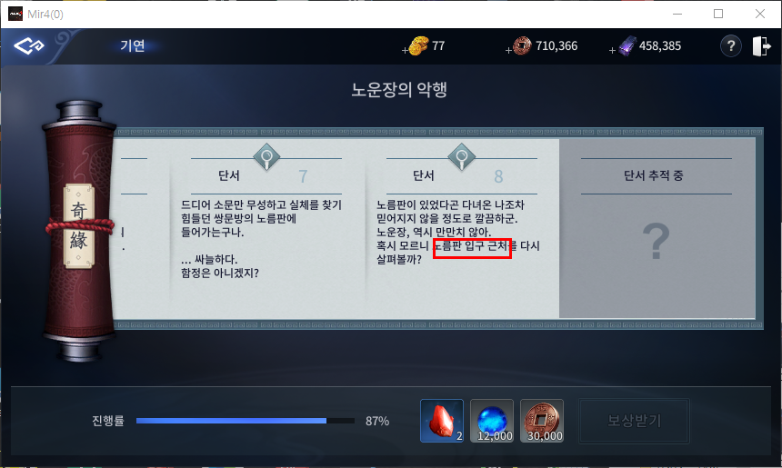 뒷골목 노름판으로 이동이 되시면 보이시는 위명옥에게 대화를 진행 후 앞으로 이동해주시면 됩니다.