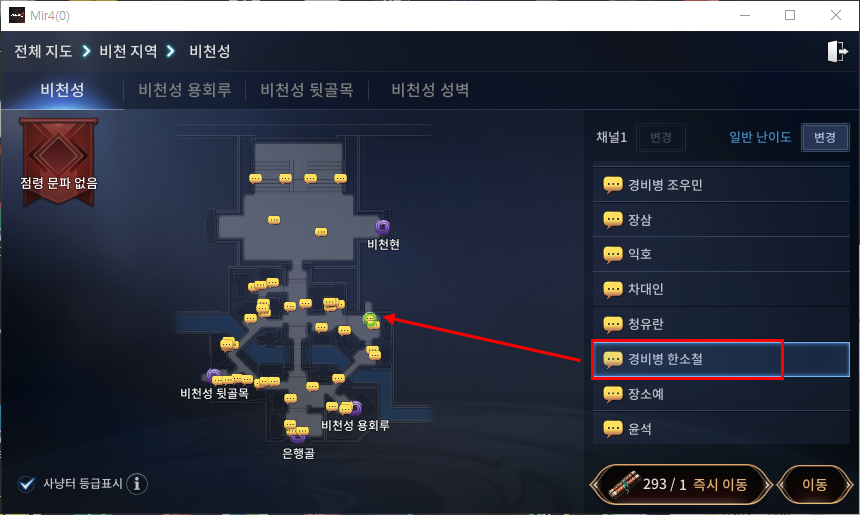 비천성 경비병은 주민NPC에 있는 '경비병 한소철'에게 이동 후 대화를 진행해주시면 됩니다.