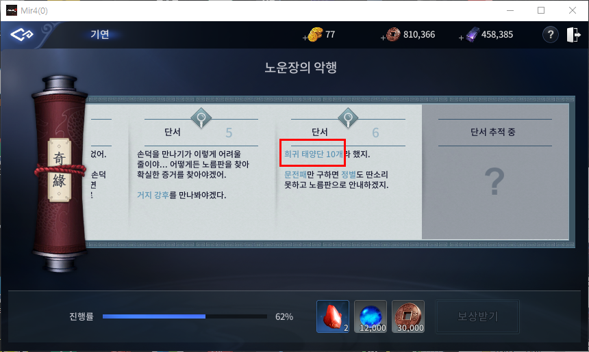 이번 기연퀘스트 대의명분 노운장의 악행은 크게 어려움은 없으나 준비물이 필요합니다. 희귀 태양단 10개를 준비해주시길 바랍니다.