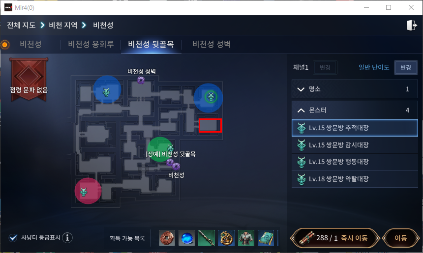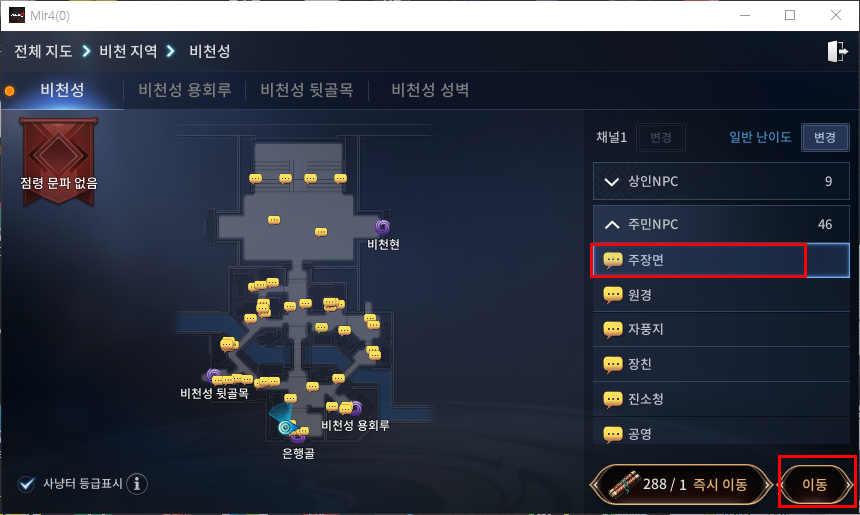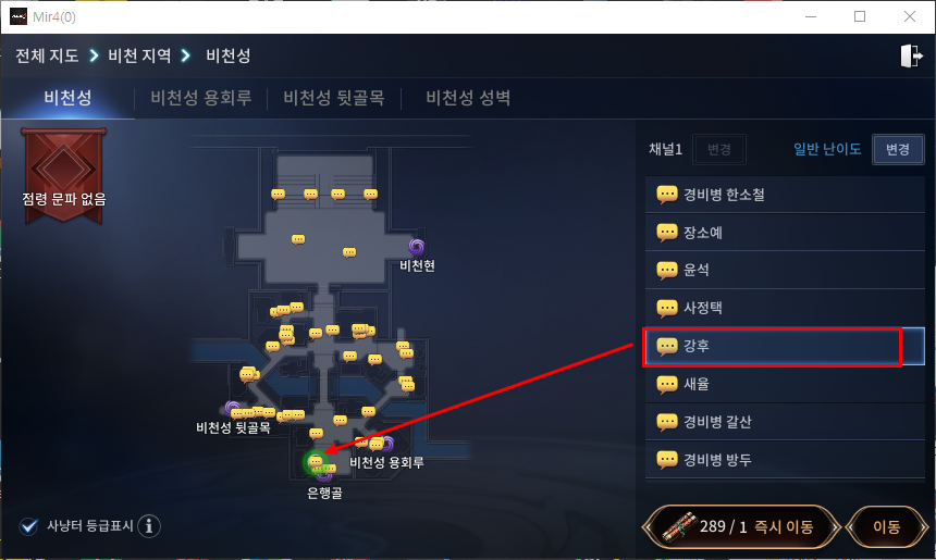 문전패를 획득하신 후 비천성 뒷골목 해당 위치로 이동해주시면 됩니다. 이동 시 '쌍문방 추적대장'에게 즉시 이동 후 표시된 위치로 이동해주시면 쉽게 이동이 가능합니다.