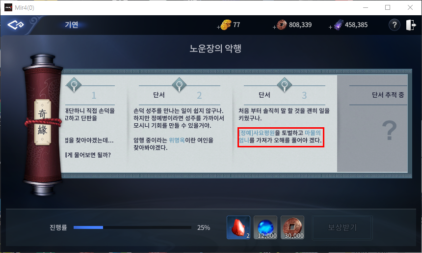 안녕하세요. 이번 기연 퀘스트는 대의명분의 노운장의 악행입니다. 항상 말하지만 기연퀘스트는 꼭 클리어해주시는게 좋습니다. 위업 성역의 사원 승급 달성 조건에 기연 퀘스트가 해당되기에 클리어 해주시면 전투력 상승에 도움이 됩닏나.