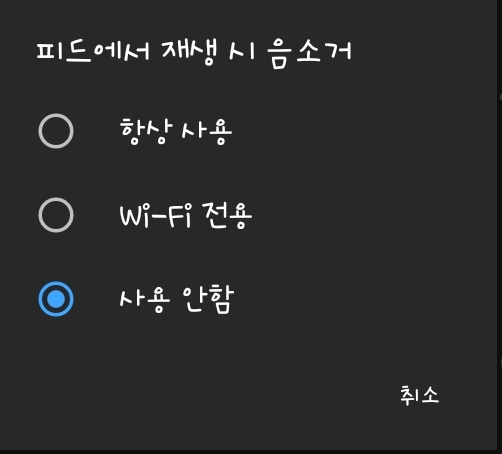피드에서 재생 시 음소거를 누르시면 위와 같이 설정이 되어있거나 Wi-Fi 전용이 선택되어 있을 수 있습니다. 항상 사용은 유튜브 자동재생이 항상 사용되는 것이며, Wi-Fi 전용은 와이파이가 연결된 상태에서만 자동재생이 사용되는 것입니다. 저는 유튜브 자동재생 해제를 할 것이기 때문에 사용 안함을 체크하겠습니다.