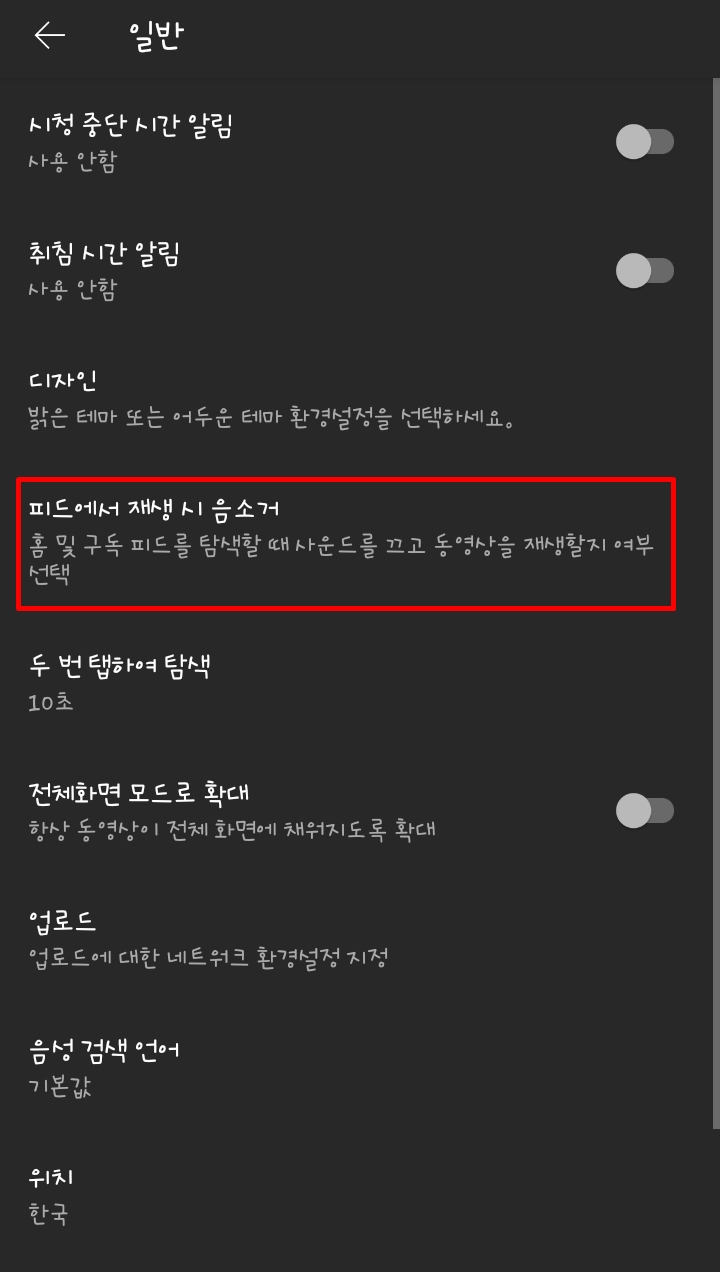 이렇게 일반 메뉴를 선택해서 들어가면 "피드에서 재생 시 음소거"라는 메뉴를 보실 수 있습니다. 해당 메뉴에서 유튜브 자동재생 미리보기를 해제할 수 있습니다.
