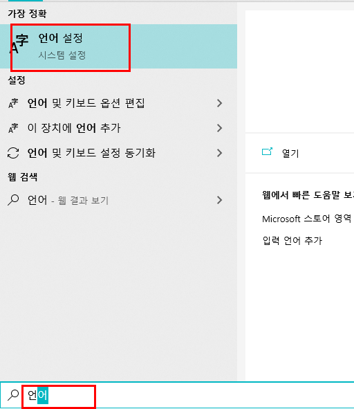 윈도우 키 또는 시작 키를 눌러서 검색창을 활성화 시켜주신 뒤 검색창에 "언어"를 입력 하시면 정확도에 맞게 '언어 설정'이 나오게 됩니다. "언어 설정"을 눌러서 설정화면으로 이동해주세요.