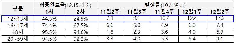 최근 11월 2주부터 12월 2주까지 발생률을 확인해보면 12~15세의 발생률이 제일 높은 것을 볼 수 있습니다. 아직 약 128만 명(12~17세)의 미접종 소아·청소년이 존재하며, 전면 등교와 지역사회 감염위험 증가 등에 따른 전염 확산 및 가족 중 고령자나 고위험군으로 2차 감염의 우려가 있는 상황이라고 합니다.