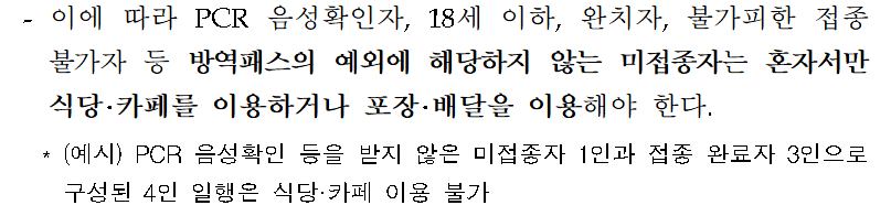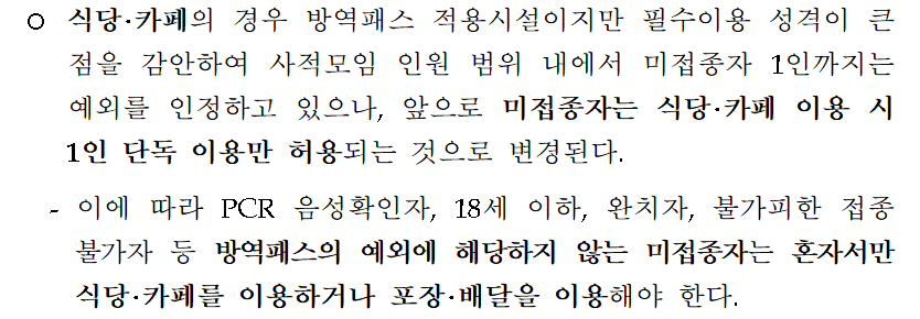 본래 17일인 금요일부터 시행될 예정이라고 했으나 본격적인 거리두기 조정안 강화 적용은 18일 00시부터 적용이 된다고합니다. 특히 이번 거리두기에서는 미접종자의 경우 음식점 등은 혼자만 이용이 가능하며, 포장 또는 배달만 허용된다고 합니다.