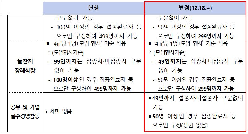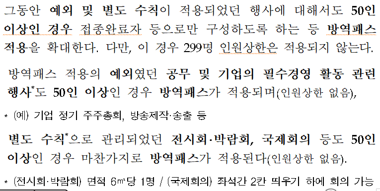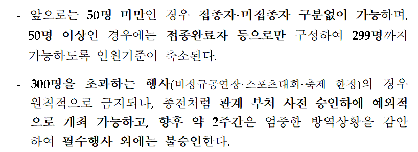 앞으로는 50명 미만인 경우 접종자와 미접종자 구분없이 가능하지만 50명 이상인 경우에는 접종 완료자 등으로만 구성하여 299명까지 가능하도록 인원 기준이 축소된다고 합니다.