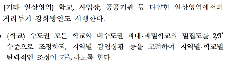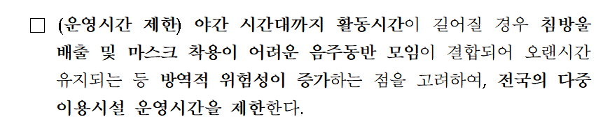 이번 거리두기 조정안 강화에서는 대면 접촉을 최대한 줄이며, 마스크를 벗고 있는 시간도 가능한 최소화할 목적이라고 합니다.