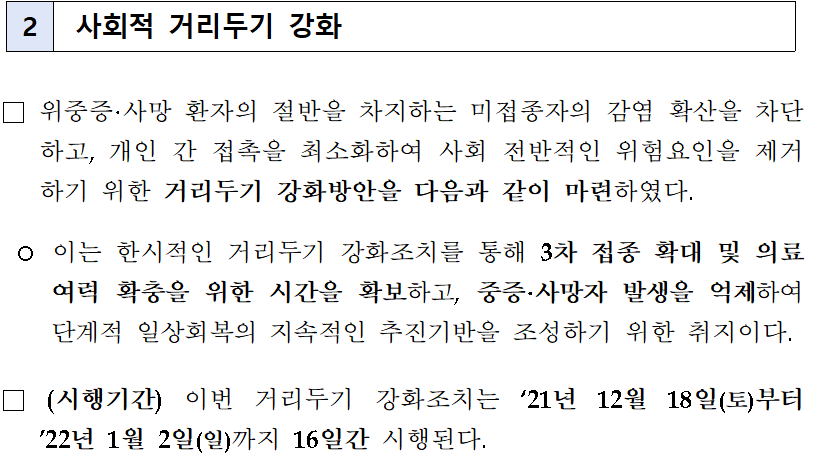 이번 거리두기 조정안에서 나온 개편된강화 기간은 2021년 12월 18일 00시부터 2022년 1월 2일까지 16일간 적용된다고 합니다.