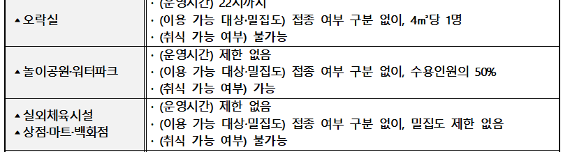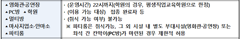 기타 : 경륜·경정·경마장, 파티룸, 키즈카페, 마사지·안마소 등 약 13만 개 (운영시간 22시까지로 제한)