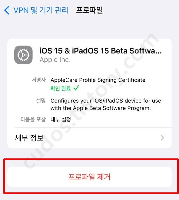 그럼 이렇게 하단에 "프로파일 제거" 버튼이 나오게 됩니다. 해당 버튼을 눌러 구성 프로파일을 제거해주시면 됩니다.