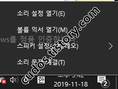 윈도우 바탕화면 오른쪽 하단에 스피커모양이 있습니다. 해당 스피커모양에 마우스 우클릭을 하신 후