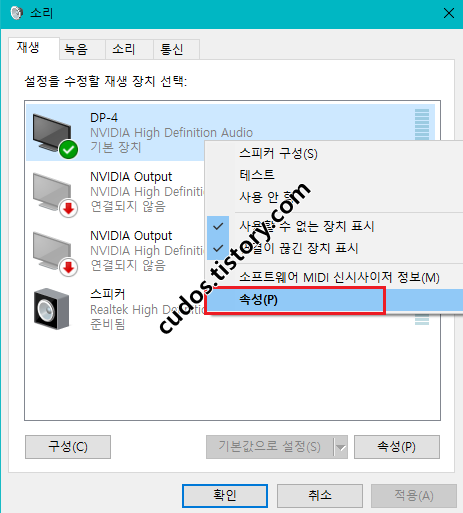 해당 화면에서 사용중인 장치에 오른쪽 마우스 클릭을 하여 [속성]을 클릭해주세요.